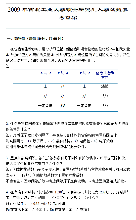 2009西北工业大学材料科学基础考研真题参考答案(3)