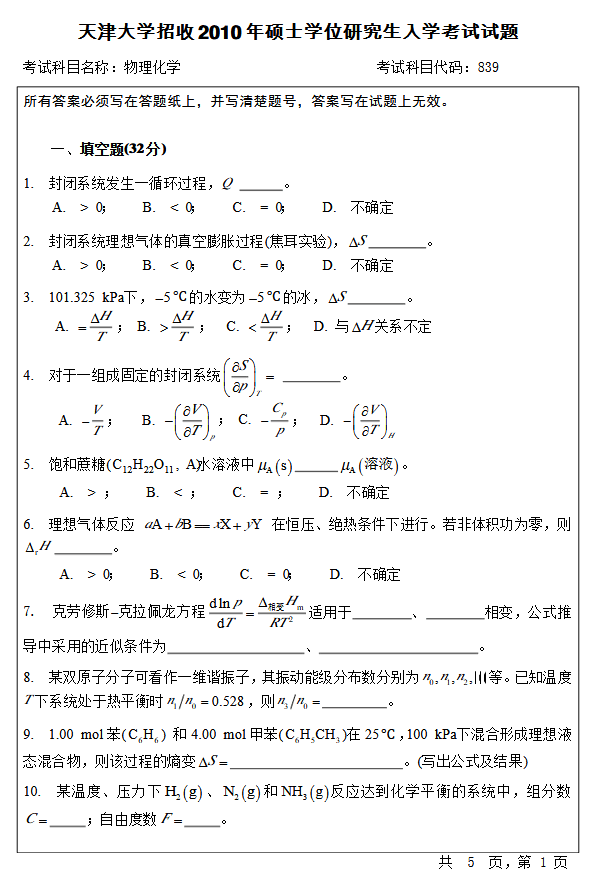 • 天津大学2003年《物理化学》考研真题答案(版本1)