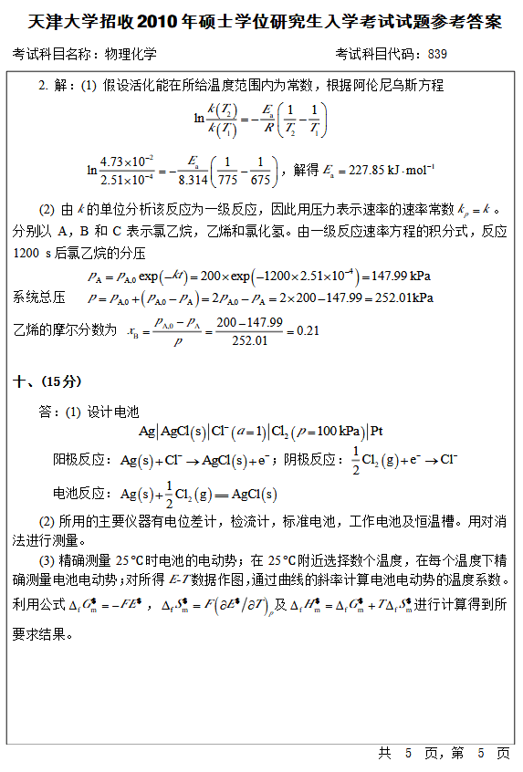 天津大学2010物理化学考研真题(10)