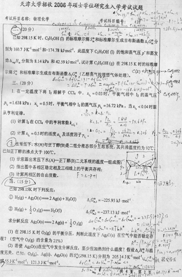 • 天津大学2003年《物理化学》考研真题答案(版本1)