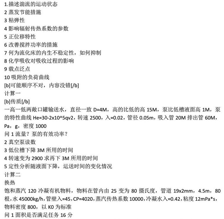 2015年试题 一、简答题(本题共30分,每小题3分) 1.列举粘弹性流体的三种行为。 2.列举三种正位移泵,什么是正位移特性? 3.简述提高搅拌湍动程度的措施。 4. 8~15微米颗粒用什么方法分离? 5.简述多效蒸发效数的限制因素。 6.简述三种汽液接触状态及各自特点。 7.简述萃取剂的要求。 8.简述透 ...