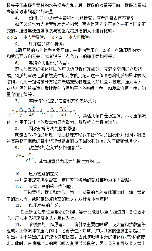 一、 选择题(略) 二、 判断题(略) 三、 简答题 1.等压面是水平面的条件是什么? :①连续介质 ② 同一介质 ③ 单一重力作用下. 2. 同一容器中装两种液体,且 ,在容器侧壁装了两根测压管。试问:图中所标明的测压管中液面位置对吗?为什么? 解:不对,(右测压管液面要低一些,从点压强的大小分析) 3. 图中 ...