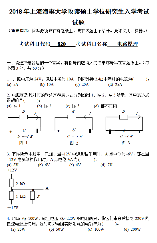 上海海事大学2018年2017年电路原理考研专业课真题