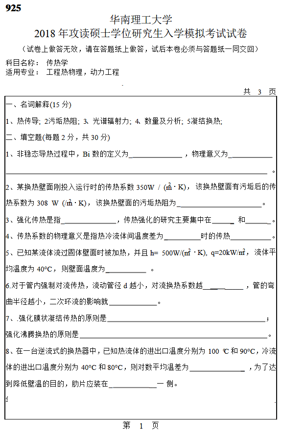 专业课考研资料 本站小编 免费考研网 2019-12-25大连理工大学2014年硕士生入学考试《传热学》试题回忆版第一部分(传热学及工程热力学名词解释10题加传热学简答题部分)