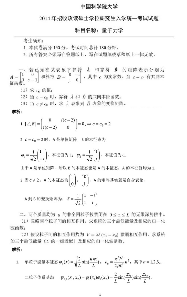 2014年中国科学院大学811量子力学考研真题附带详细答案