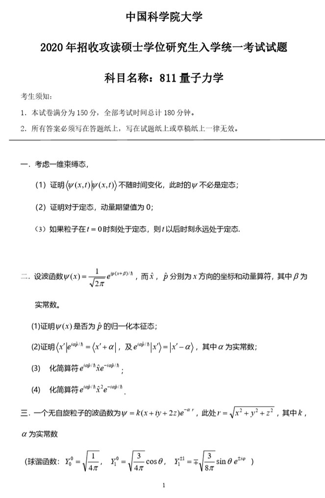 2020年中国科学院大学811量子力学考研真题附带详细答案
