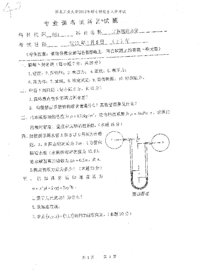 西北工业大学2011-2015年861工程流体力学考研真题(10)