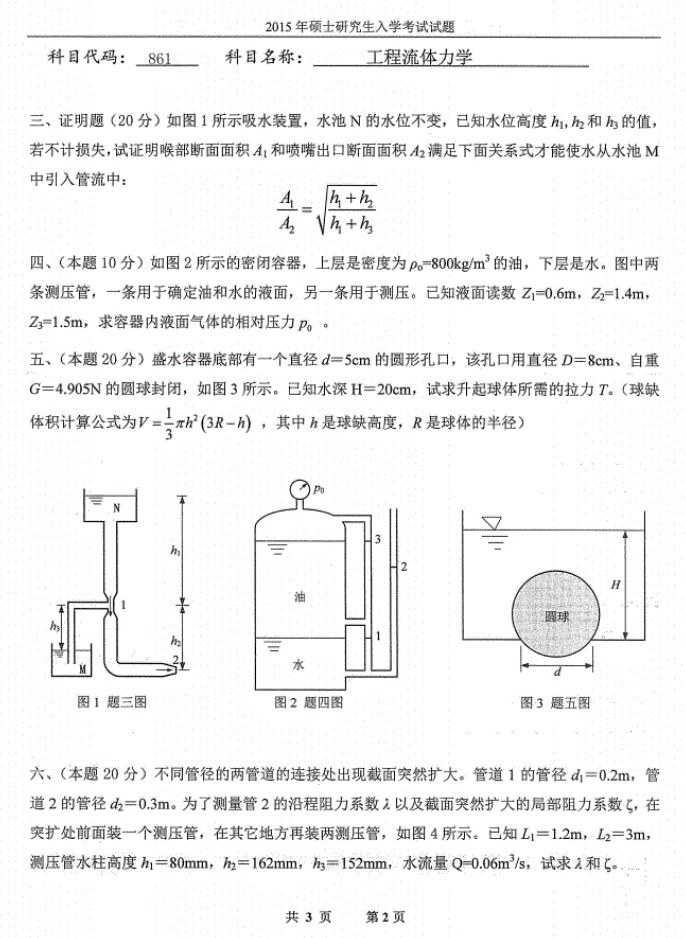 西北工业大学2011-2015年861工程流体力学考研真题(2)