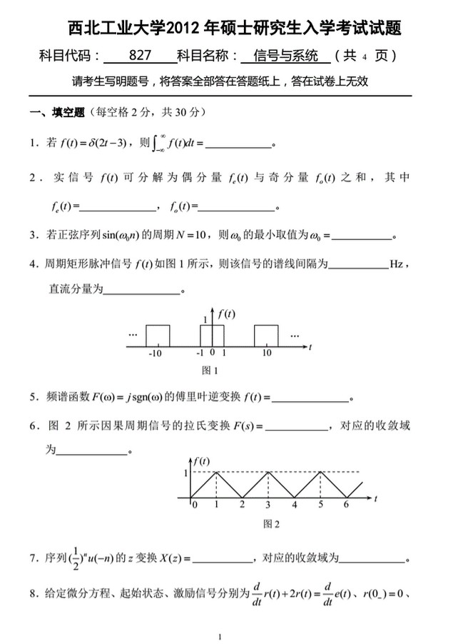 2011-2015年西北工业大学827信号与系统考研真题(18)