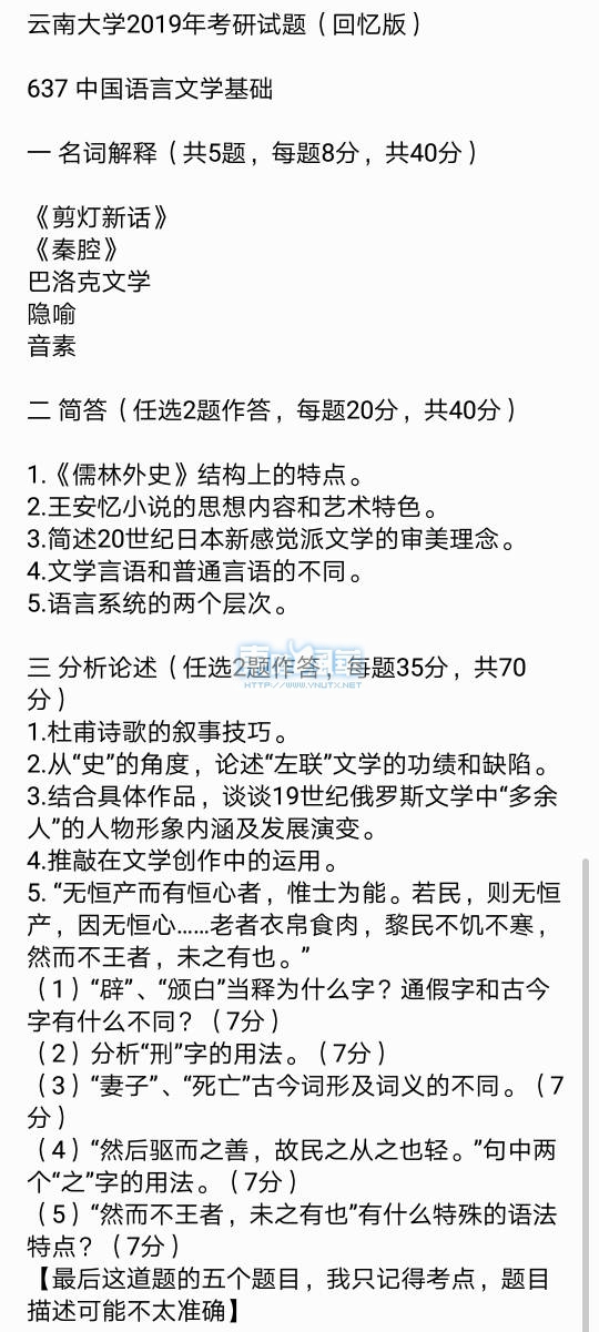 专业课考研资料 本站小编 免费考研网 2020-01-31云南大学2019中国语言基础真题