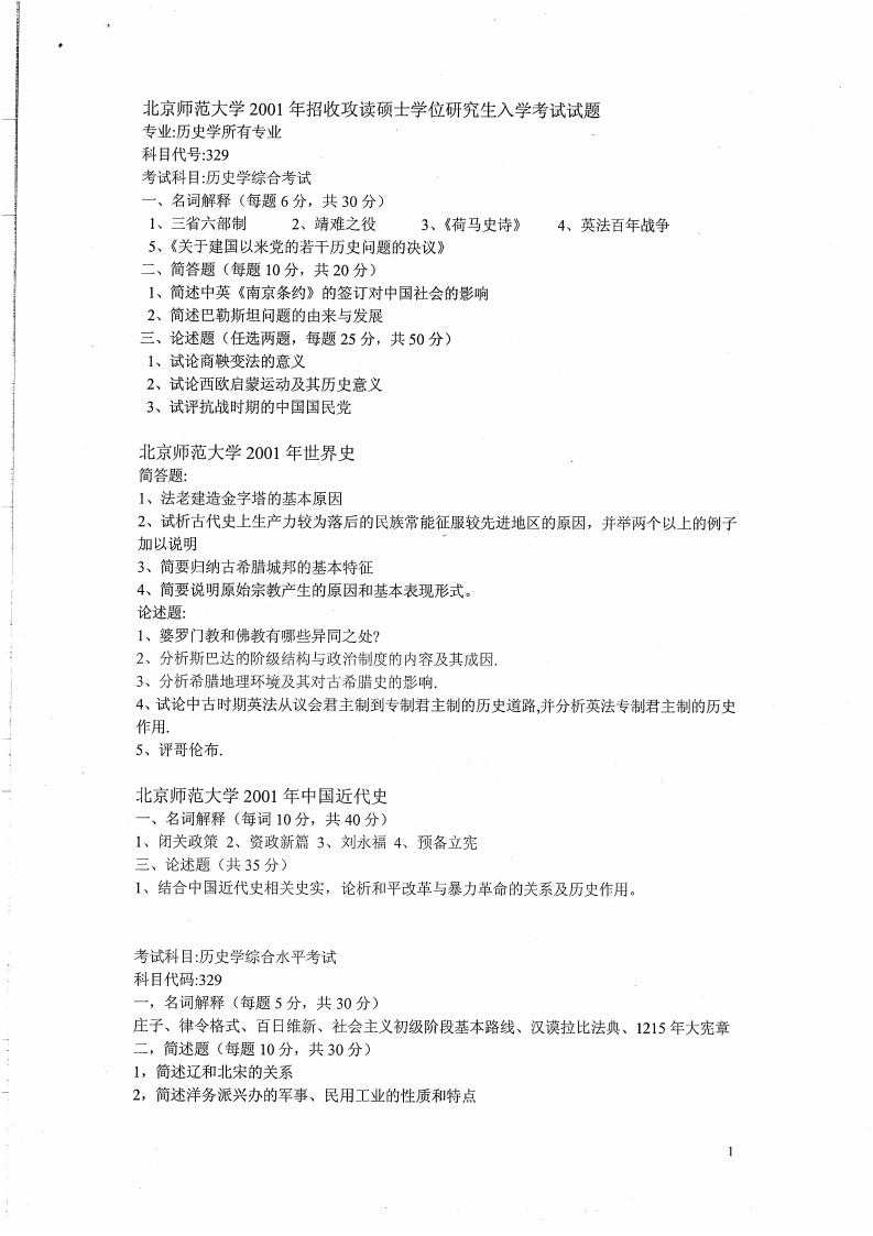 2001-2012年北京师范大学历史学所有专业综合考研真题及部分答案