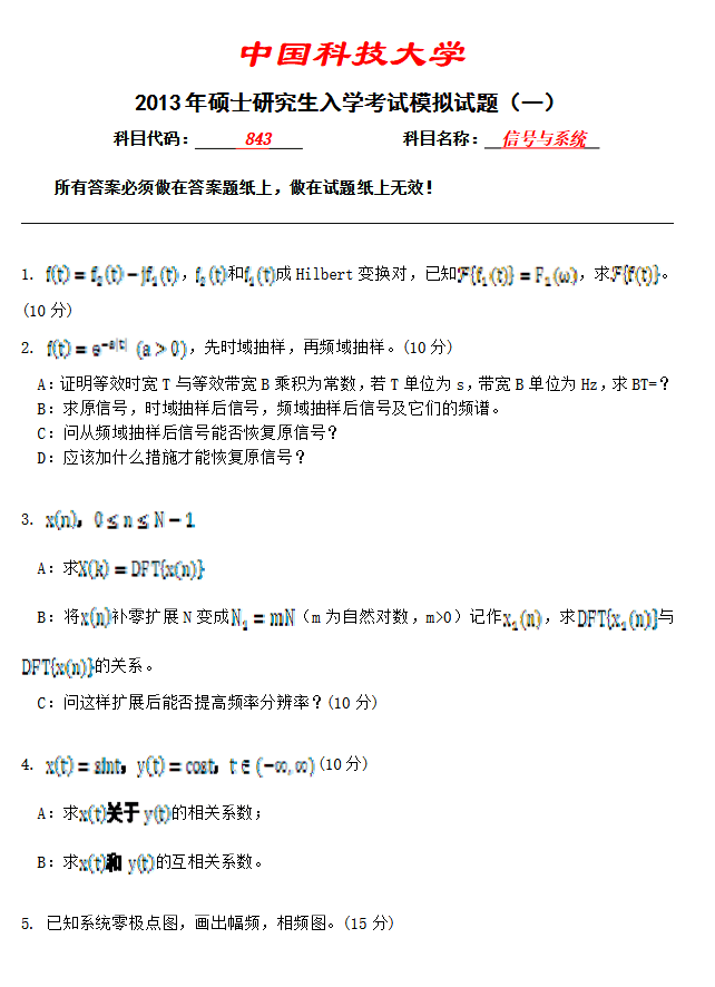 中国科技大学843信号与系统考研模拟题一带详细答案