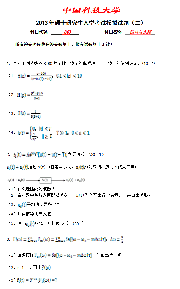 中国科技大学843信号与系统考研模拟题一带详细答案