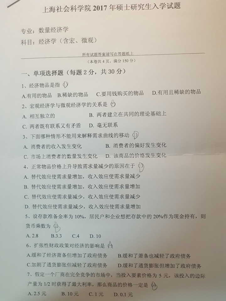 一、单项选择题(共15小题,每题2分,共30分) 1、由于生产资源是稀缺的,所以,为了多生产一种产品就要少生产另一种产品。这是下列哪一种概念的本质?( ) A、专业化; B、比较优势; C、机会成本; D、边际替代率; 2、如果名义利率为12%,预期的通货膨胀率为8%,那么实际利率为( ) A、4%; B、8%; C、20%; D、 ...专业课考研资料 本站小编 免费考研网 2020-02-09二本考上中南财经政法大学经济法学硕的经验