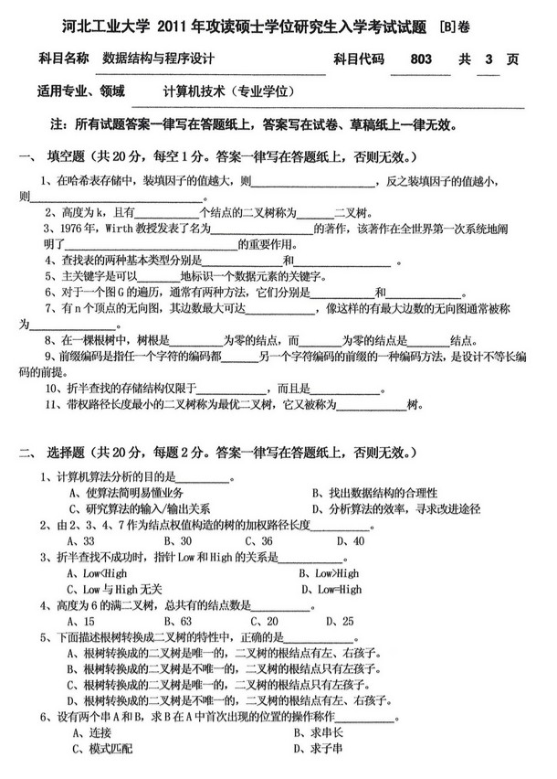 2017年华北电力大学844数据结构考研真题 选择十个,一个两分,20分 填空十个空,20分,这些都是最简单的,树的知识,链表的知识 简答题,顺序和链式结构优缺点, 哈希表构建基本思想 设置岗哨的作用并举例 算法题,单链表查找最大值算法10分,求叶子节点数算法7分,求完全二叉树深度算法8分,邻接表定义以 ...