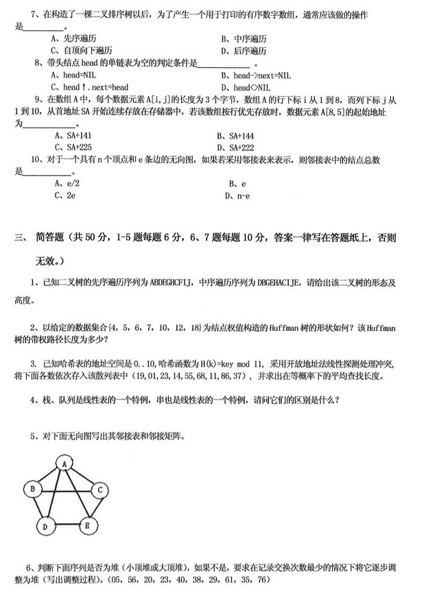 915数据结构B真题回忆 一、简答题 1、什么是数据结构? 2、什么是逻辑结构? 3、什么是顺序存储结构?链式存储结构? 4、什么是时间复杂度? 5、n个顶点的无向图最多有几条边?56条边至少有几个顶点? 6、忘了。。。 7、什么叫排序方法的稳定性?分别列举稳定和不稳定的排序方法? 二、队列置空,入队,出队,求最大值#820 ...