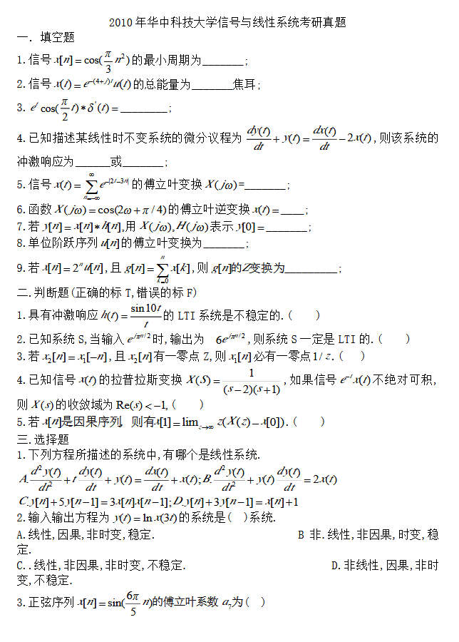 2010-2014年华中科技大学信号与系统824考研真题带详细答案