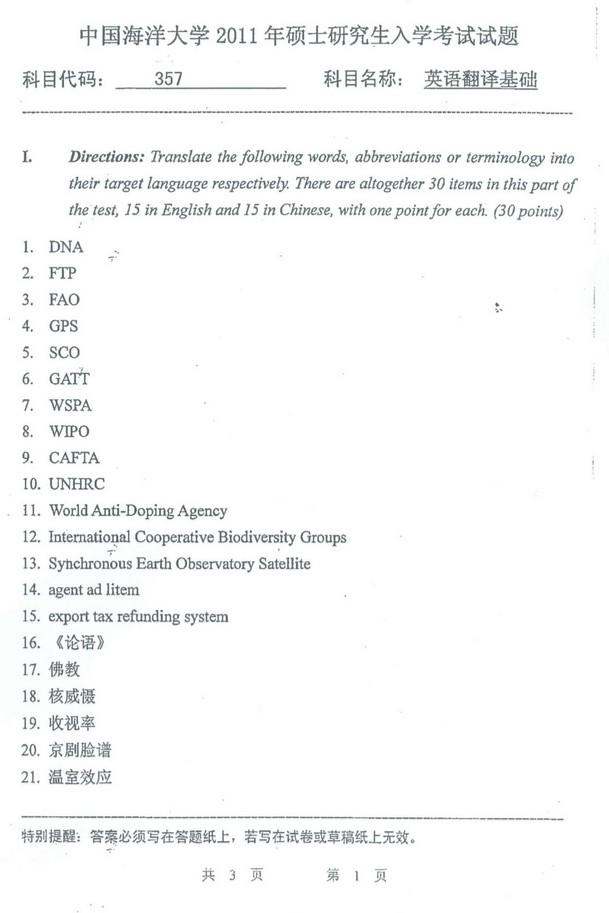 • 2012中国海洋大学MTI英语翻译基础真题回忆原版