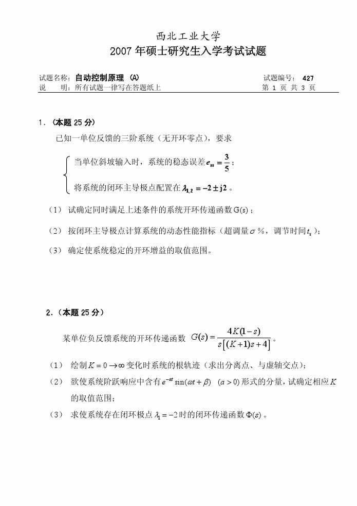 西北工业大学2001-2010自动控制原理考研试题(19)