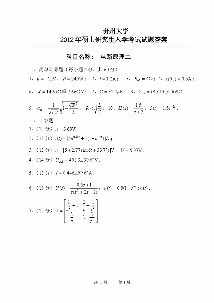 2000-2014年贵州大学电路考研真题与答案解析(67)