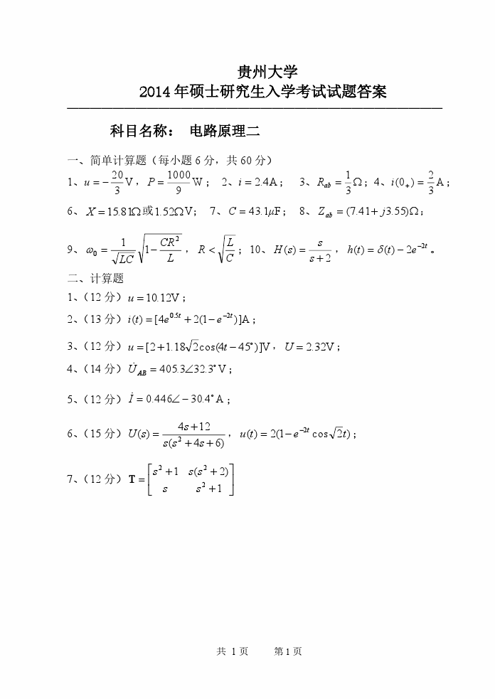 2000-2014年贵州大学电路考研真题与答案解析(75)