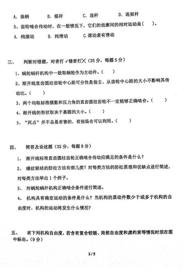 1.一大题 14道选择(28分)选择题题号不是这样的选择题记不全了 2. 1.为保证链传动正确啮合,两链轮应该怎么设置。选择应在同一铅垂面内。 3. 2.蜗轮蜗杆的计算题,给出了蜗杆的参数和转速和涡轮的分度圆直径,问涡轮的速度,直接套公式,选择50多 r/min 那个选项。 4. 3.给涡轮齿面强度公式,问带那个许用应力,当 ...