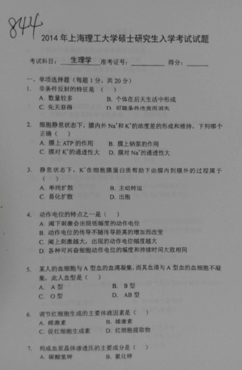 2014年上海理工大学844生理学考研试题