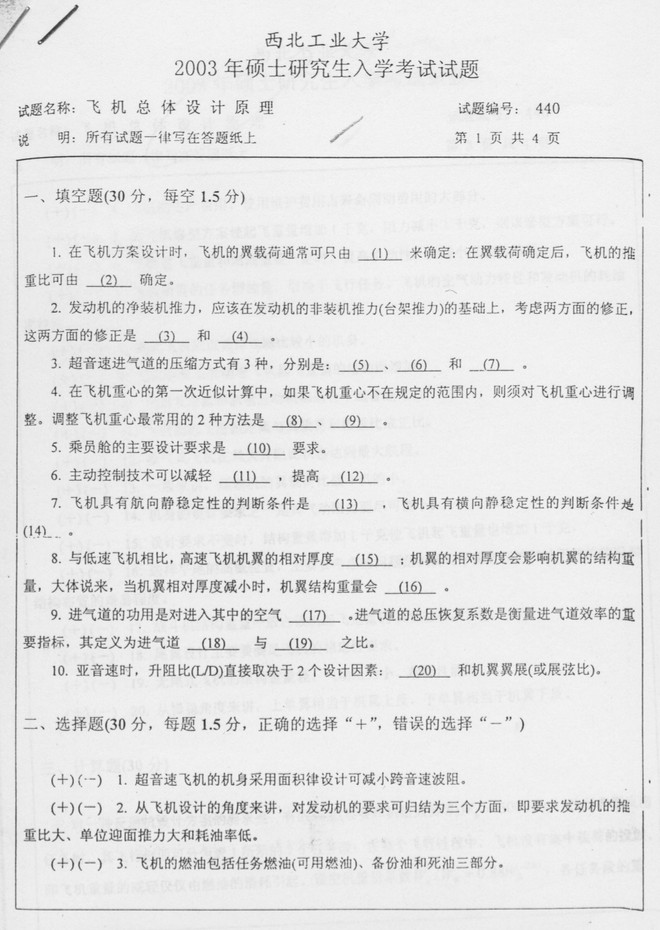 西北工业大学飞机总体设计原理历年考研真题(8)