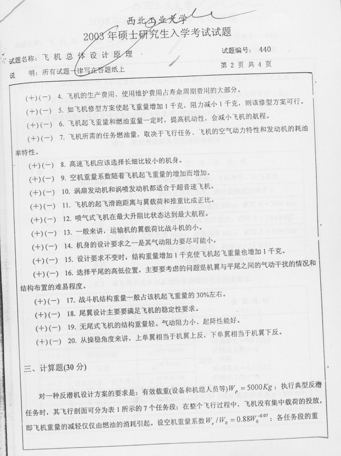 西北工业大学飞机总体设计原理历年考研真题(9)