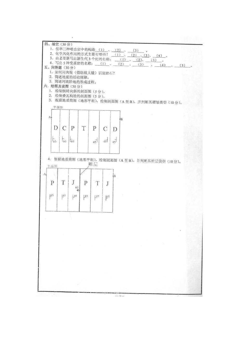三种题型: 简答题7题选5题,论述题4题选2题,读图题。 7选5 1.岩浆岩,沉积岩,变质岩相互转化关系 2.地壳中含量最高的8种元素?含量最高的是? 3.内源沉积岩结构成因分类? 4.角度不整合识别方法? 5.岩石地层单位,生物地层单位,时间地层单位相互关系,举例说明? 6.区分泥岩和断层泥 7.极射赤平投影的应用 论 ...