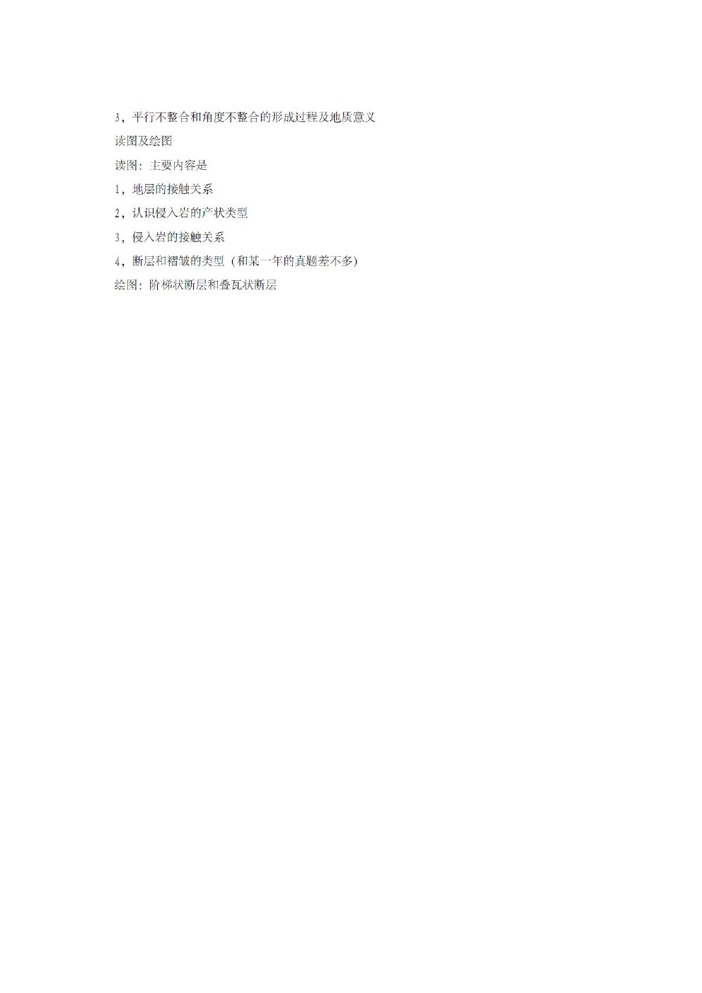 三种题型: 简答题7题选5题,论述题4题选2题,读图题。 7选5 1.岩浆岩,沉积岩,变质岩相互转化关系 2.地壳中含量最高的8种元素?含量最高的是? 3.内源沉积岩结构成因分类? 4.角度不整合识别方法? 5.岩石地层单位,生物地层单位,时间地层单位相互关系,举例说明? 6.区分泥岩和断层泥 7.极射赤平投影的应用 论 ...