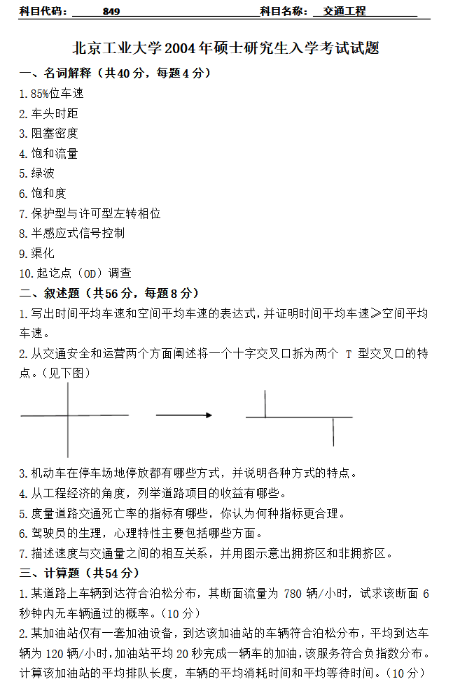 科目代码:849 科目名称:交通工程 北京工业大学2010年硕士研究生入学考试试题 一、名词解释(共36分,每题3分) 1.信号配时中的绿信比是什么 2.保护型与许可型左转相位 3.何谓临界车速 4.车头时距与车头间距 5.M/M/1系统处于稳定状态的条件 6.85%位车速定义和在交通中的应用 7.出行时间等时线 ...