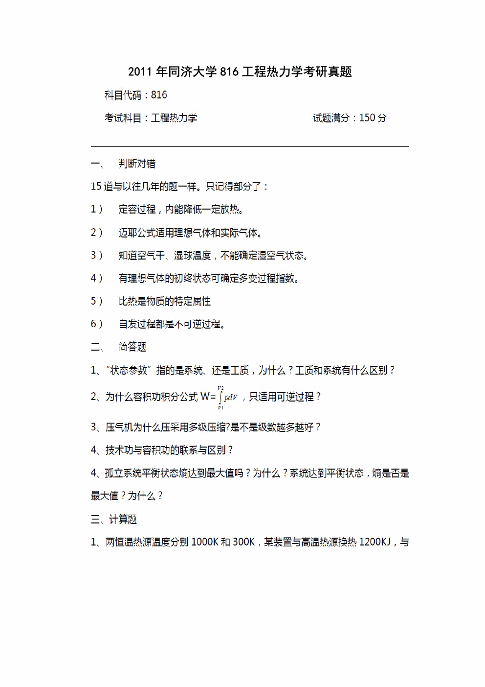 同济大学2014-1998工程热力学816考研真题试题(29)