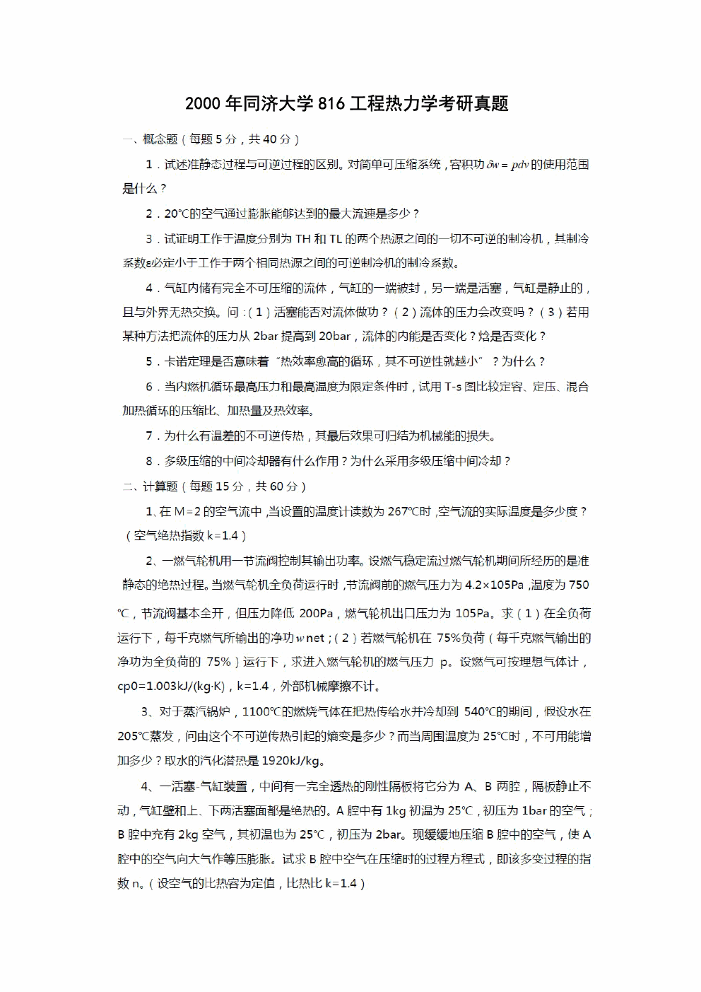 同济大学2014-1998工程热力学816考研真题试题(4)