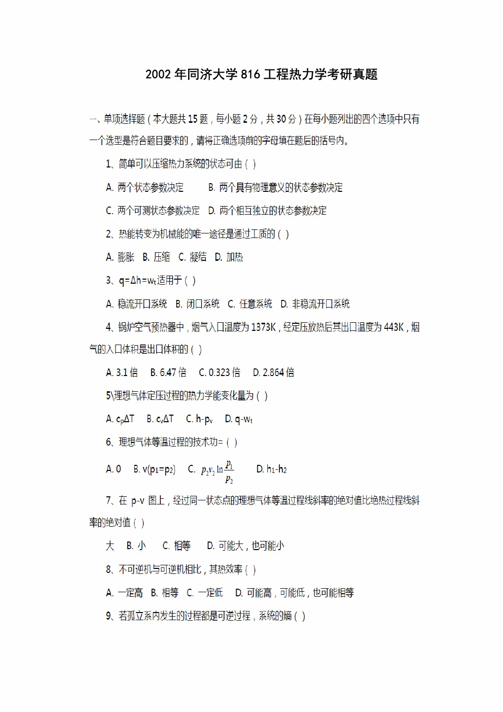 同济大学2014-1998工程热力学816考研真题试题(9)