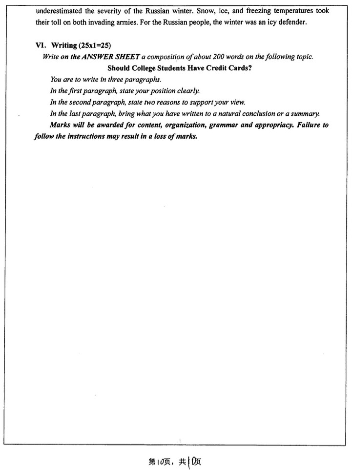 ㈠基础英语: 20个单选,几乎都是词汇辨析,难度适中,撑死专八难度,比如说euphoria/rapture,customary/cumstom/accustomed 完形填空(20个) 2篇阅读,专八难度 一段英译汉 一段汉译英 作文 北大学生毕业后选择卖猪肉,有人认为他这么做是浪费了他在名校所享受到的资源,有人支持他的选择。你的看法 ㈡大综合: ● ...