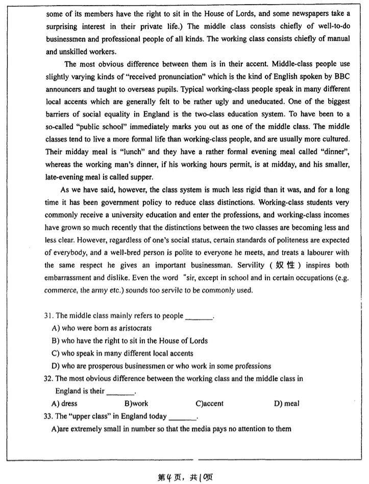 ㈠基础英语: 20个单选,几乎都是词汇辨析,难度适中,撑死专八难度,比如说euphoria/rapture,customary/cumstom/accustomed 完形填空(20个) 2篇阅读,专八难度 一段英译汉 一段汉译英 作文 北大学生毕业后选择卖猪肉,有人认为他这么做是浪费了他在名校所享受到的资源,有人支持他的选择。你的看法 ㈡大综合: ● ...