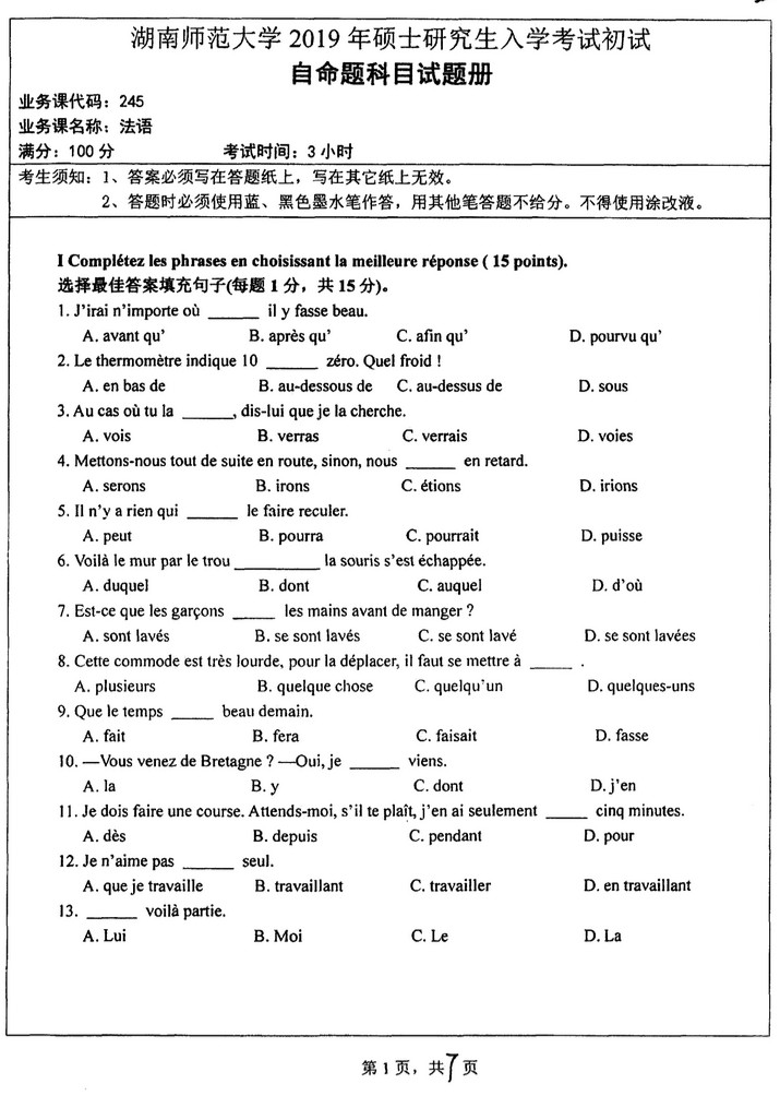 初试篇 2019 真题回忆 基础法语: 1.单选 2.时态填空 3.词汇选择 4.完形填空 5.阅读: 第一篇笔译三级里的原题 第二篇很长很长.... 6.法译汉: 7.汉译法: 涉及电影技术,电影,胶片之类 综合法语 1.单选 2.正误判断 考了一个缩写 3.填空: 有个题问卢浮宫建了是用来干什么的 4.名词解释:romant ...