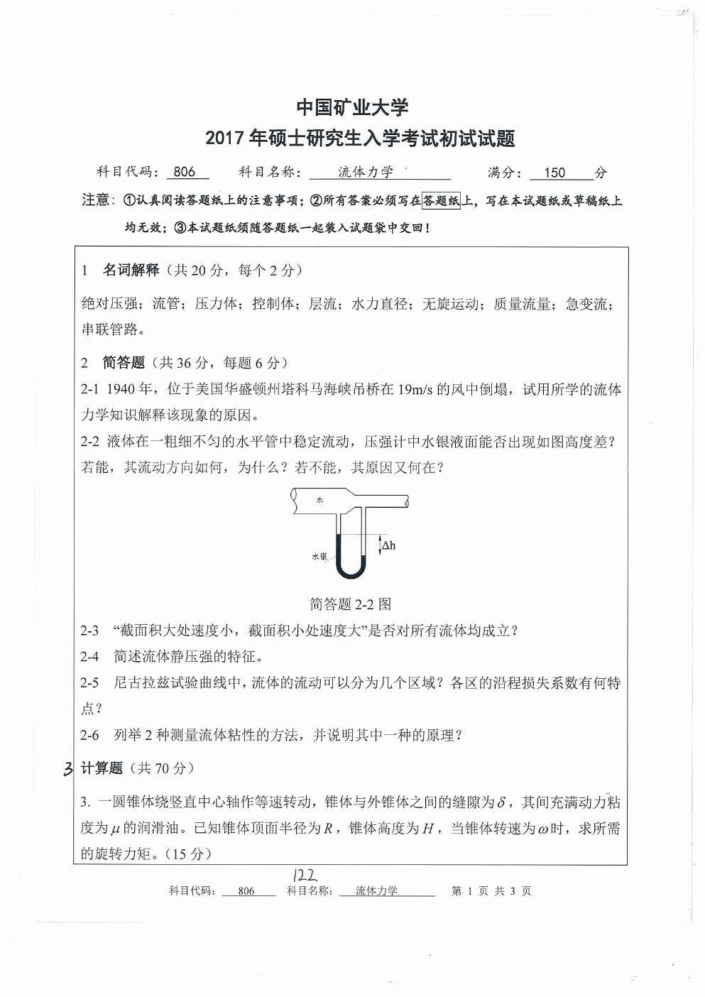 中国矿业大学徐州2017-2014流体力学806考研真题(9)