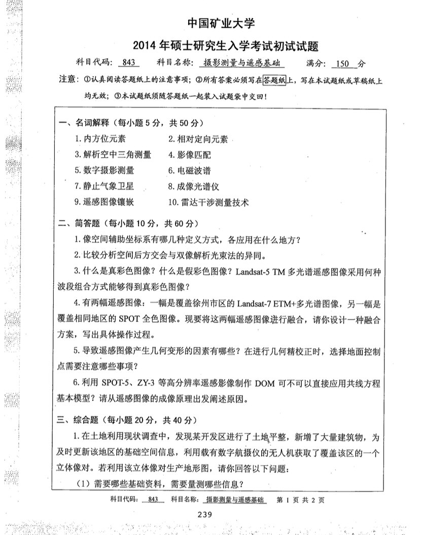 中国矿业大学2014-2013遥感原理与应用843考研真题