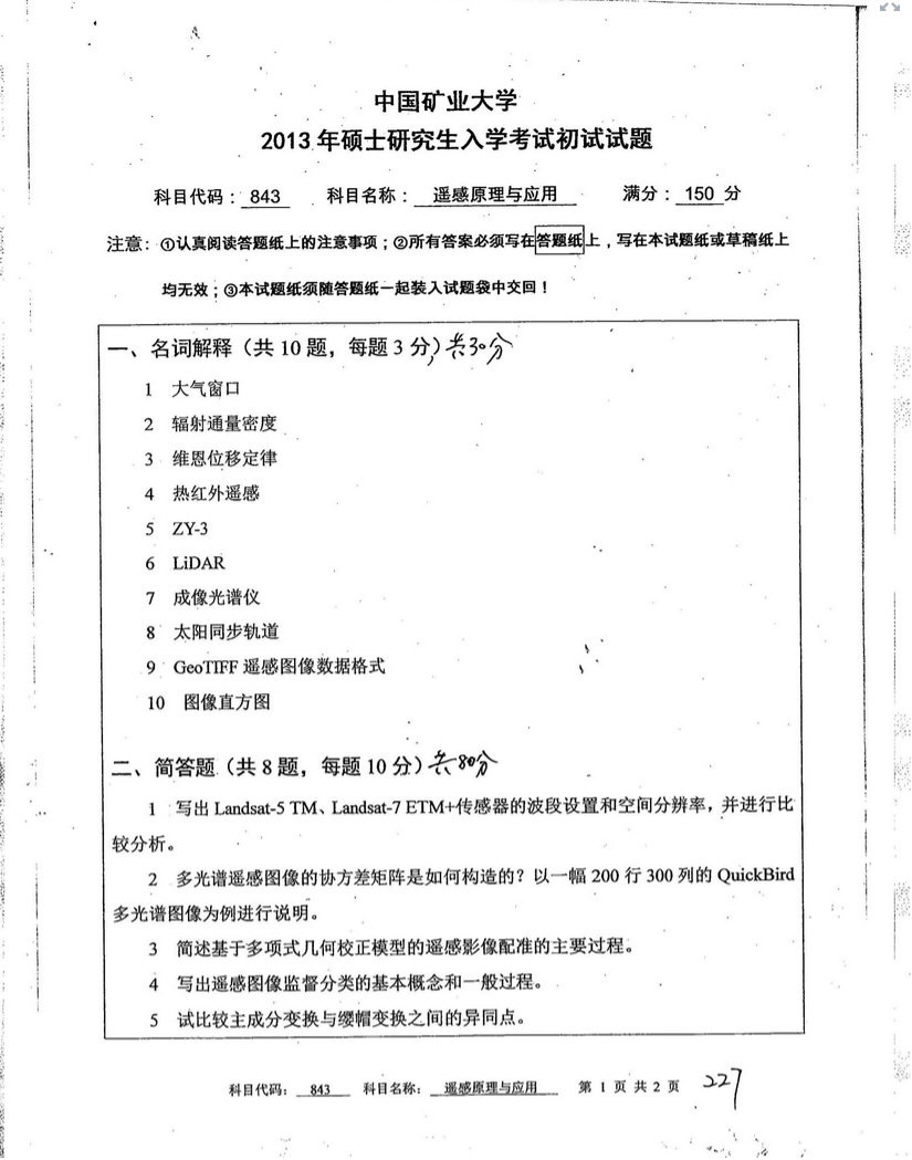 中国矿业大学2014-2013遥感原理与应用843考研真题(3)