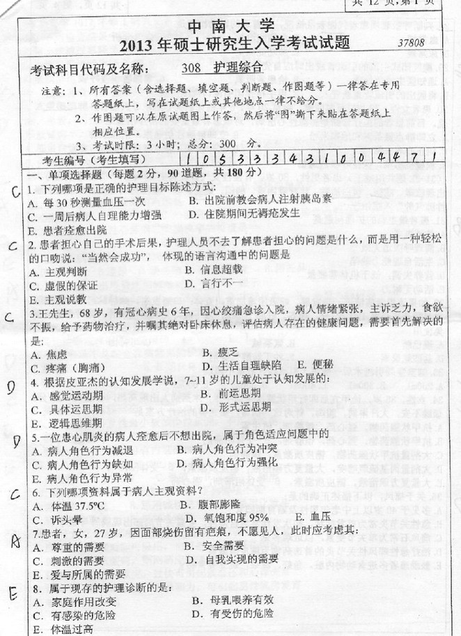 2013年中南大学308护理综合考研真题