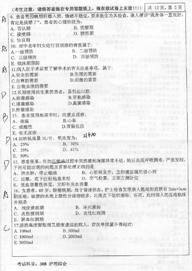 单选多选病理分析 单选比较简单,考察的都比较灵活 多选不难,就是四个答案错一个也不给分,要求对知识点把握的很准确 病理分析,三道题,护理基础比较偏,考了导尿,外科考的消化性溃疡穿孔 内科考的心梗 ...