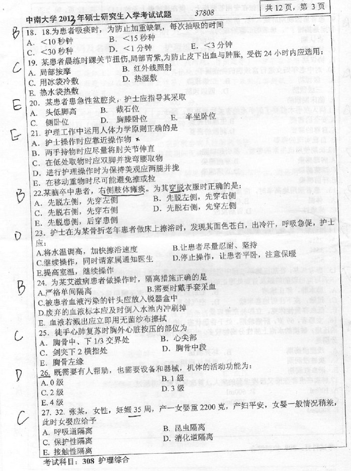 单选多选病理分析 单选比较简单,考察的都比较灵活 多选不难,就是四个答案错一个也不给分,要求对知识点把握的很准确 病理分析,三道题,护理基础比较偏,考了导尿,外科考的消化性溃疡穿孔 内科考的心梗 ...