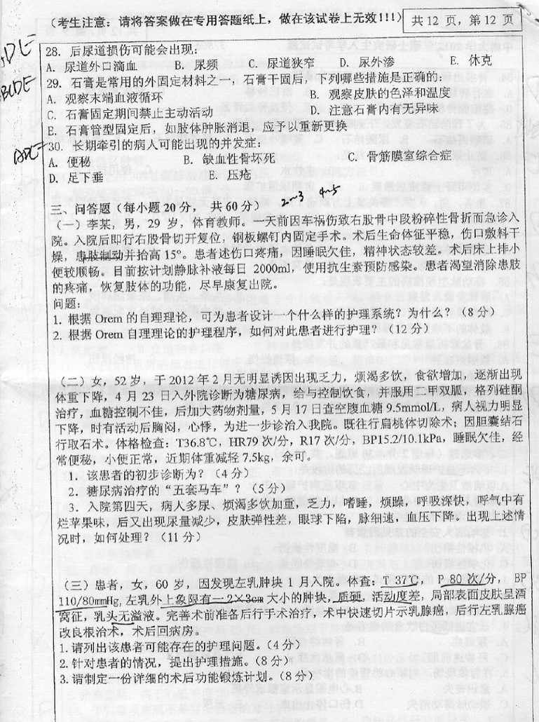 单选多选病理分析 单选比较简单,考察的都比较灵活 多选不难,就是四个答案错一个也不给分,要求对知识点把握的很准确 病理分析,三道题,护理基础比较偏,考了导尿,外科考的消化性溃疡穿孔 内科考的心梗 ...