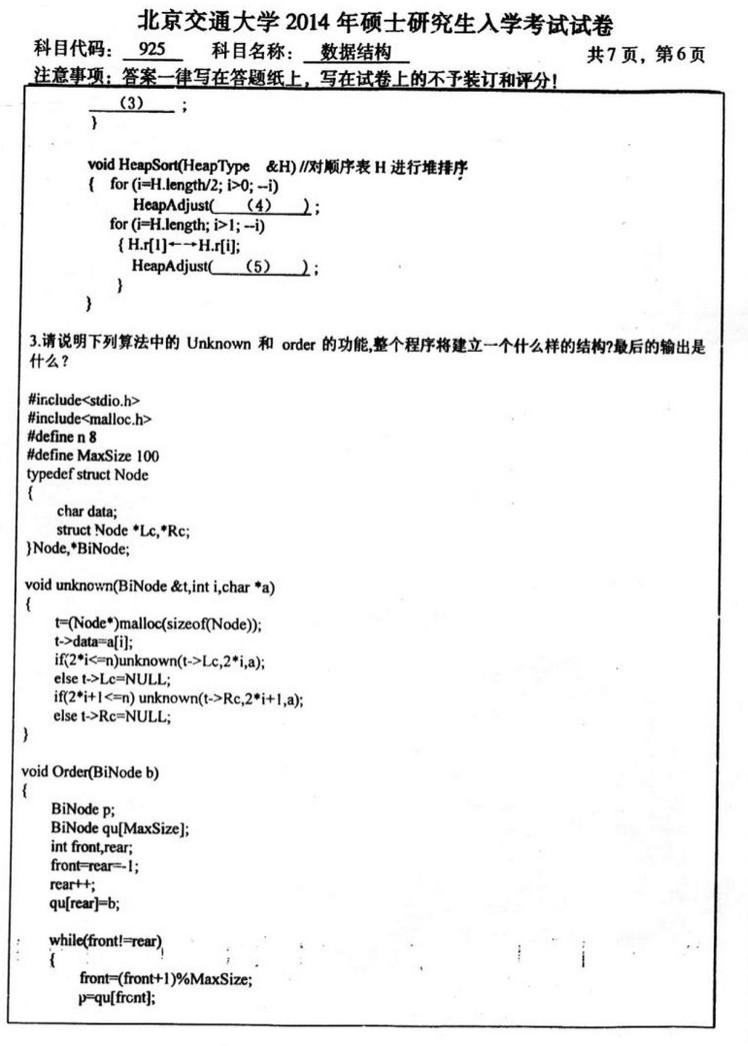 2014年北京交通大学数据结构925考研真题(6)