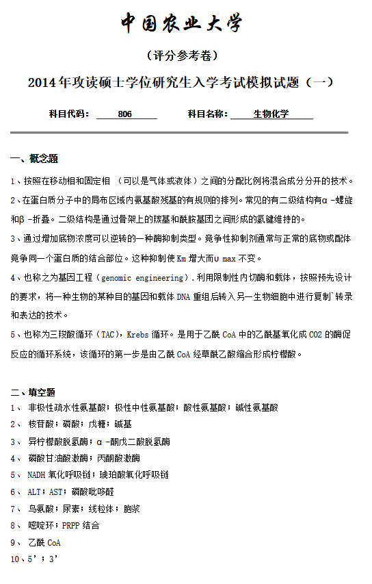 中国农业大学806生物化学2014年考研考前最后二套题(8)