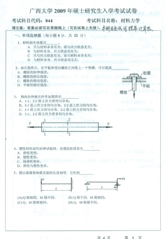 2009-2011年广西大学土木学院材料力学844考研真题(9)