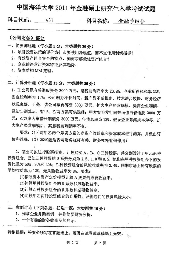 2011中国海洋大学431金融学综合金融考研真题(2)