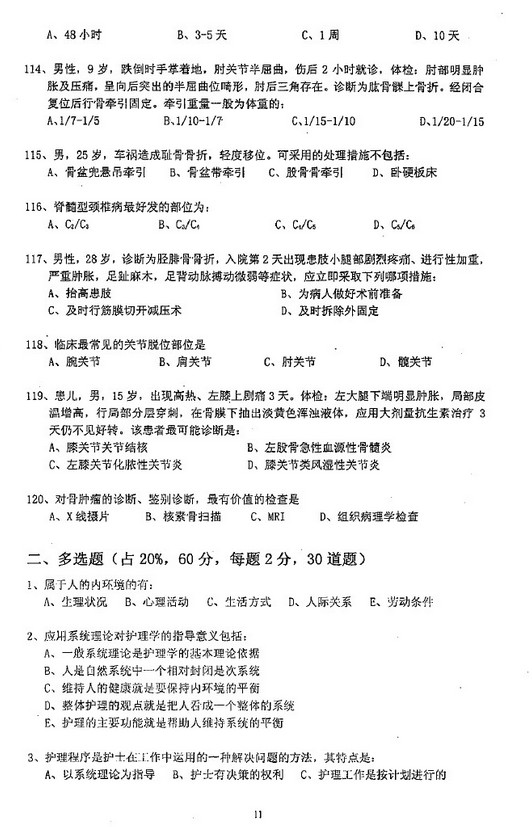 单选多选病理分析 单选比较简单,考察的都比较灵活 多选不难,就是四个答案错一个也不给分,要求对知识点把握的很准确 病理分析,三道题,护理基础比较偏,考了导尿,外科考的消化性溃疡穿孔 内科考的心梗 ...